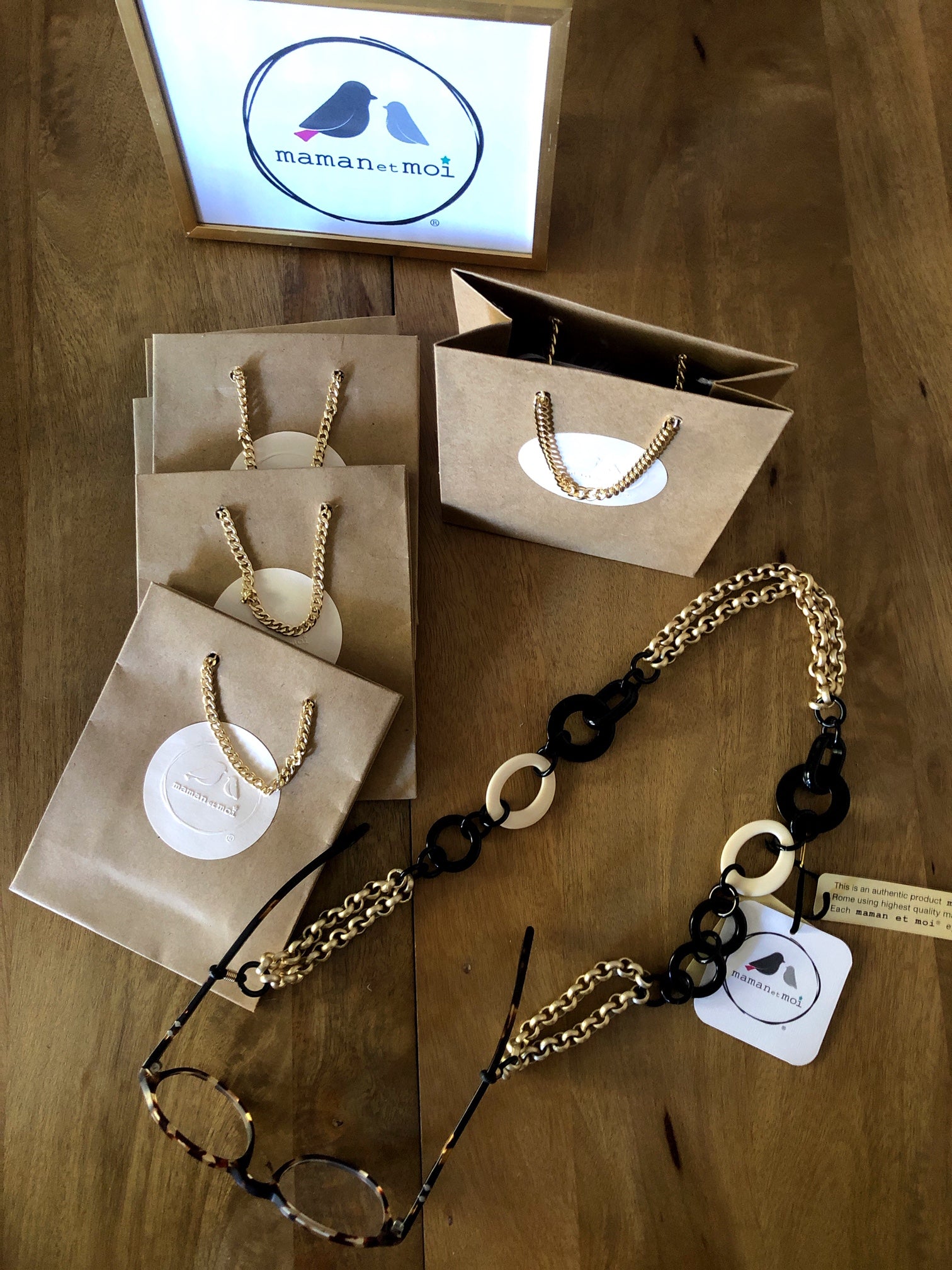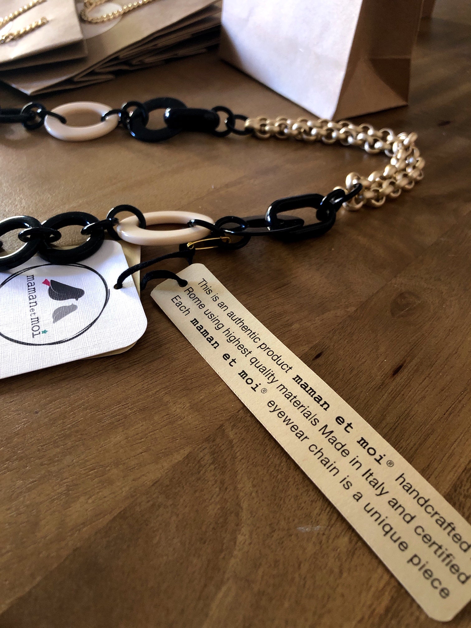 Catena per occhiali in resina, alluminio con bollatina Maman et moi.
