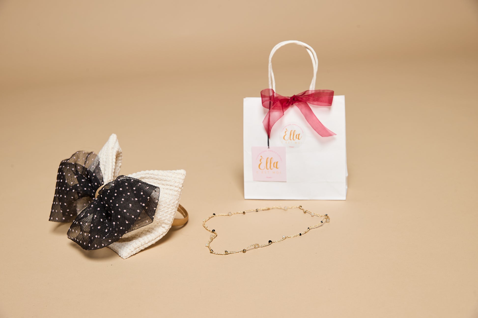 Cerchietto hand made con grande fiocco in tessuto Chanel e tulle nero a pois