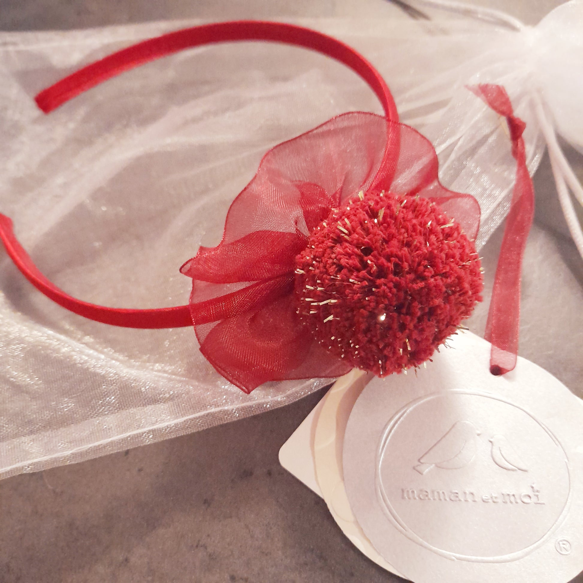 Cerchietto in raso con pon pon di lana con fili oro e tulle.