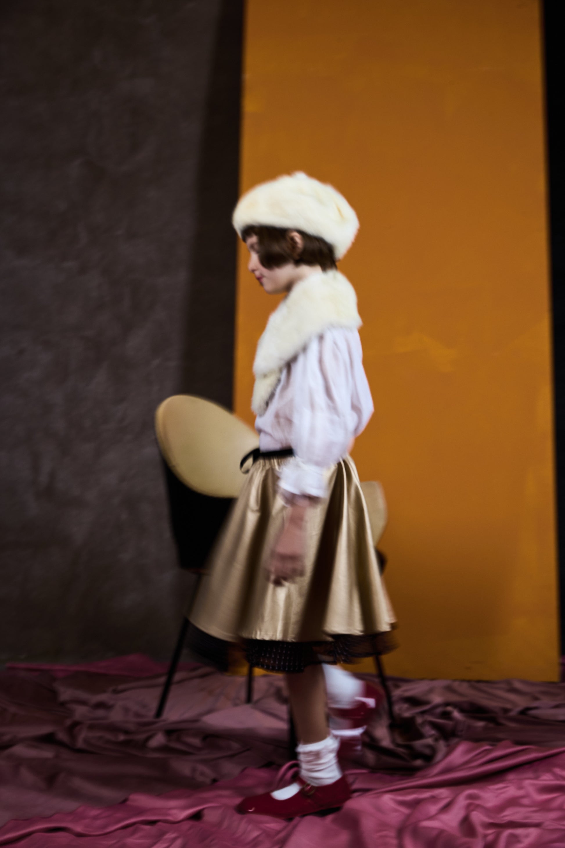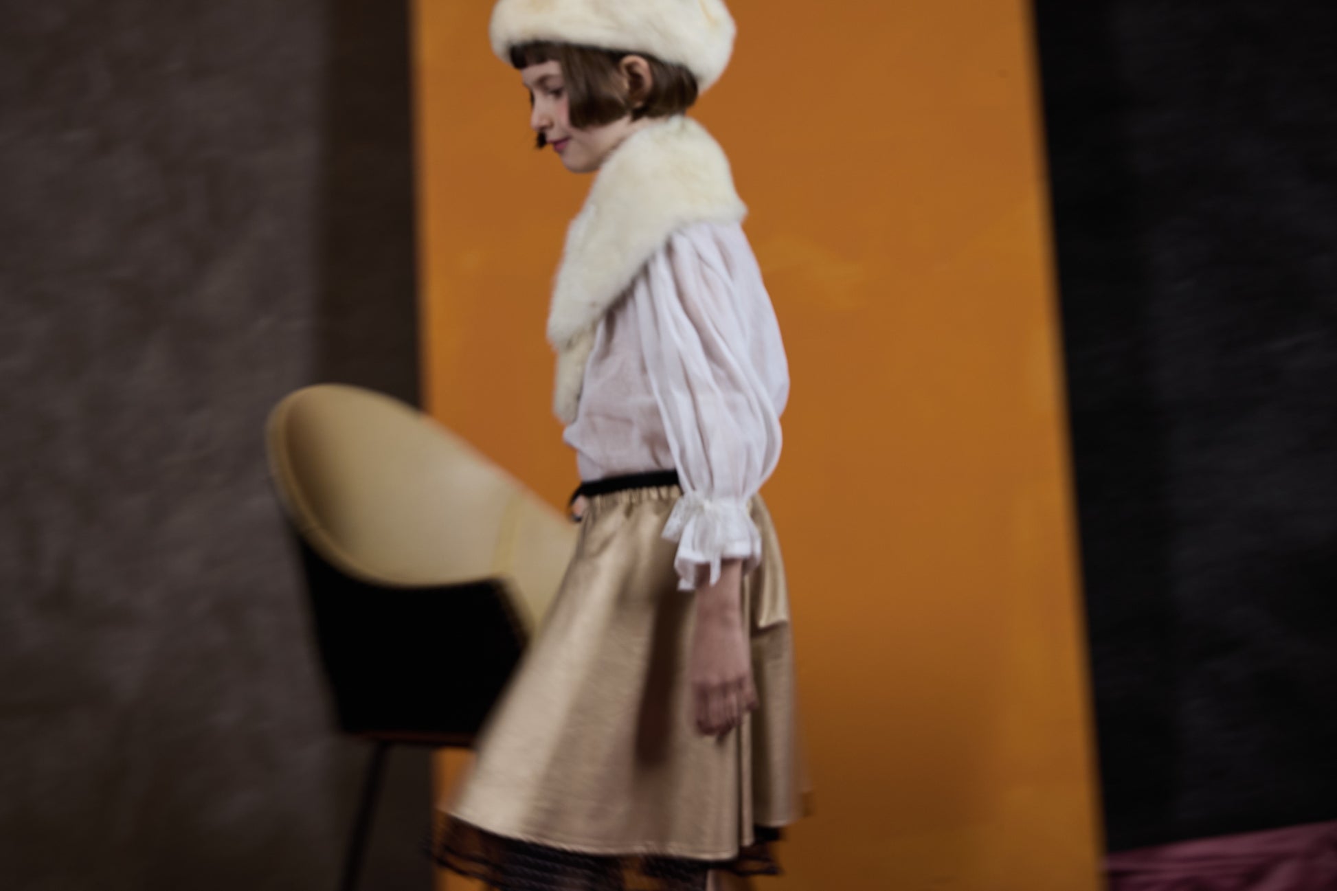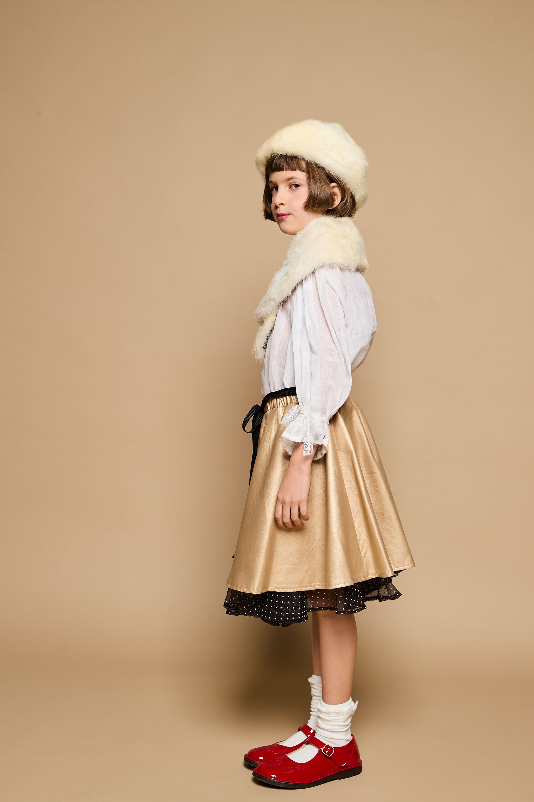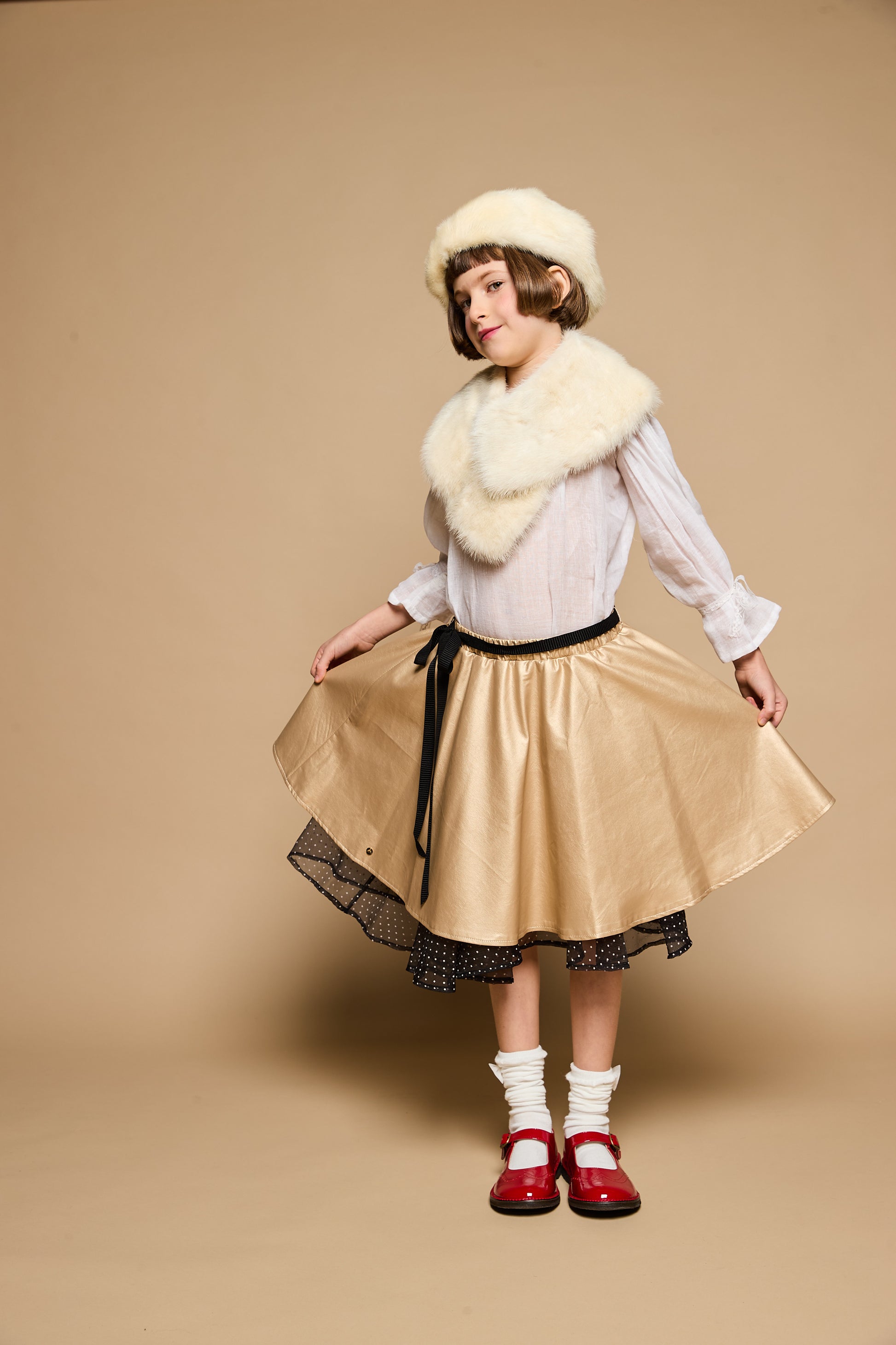 Gonna a ruota in ecopelle oro con ampio doppio strato in tulle