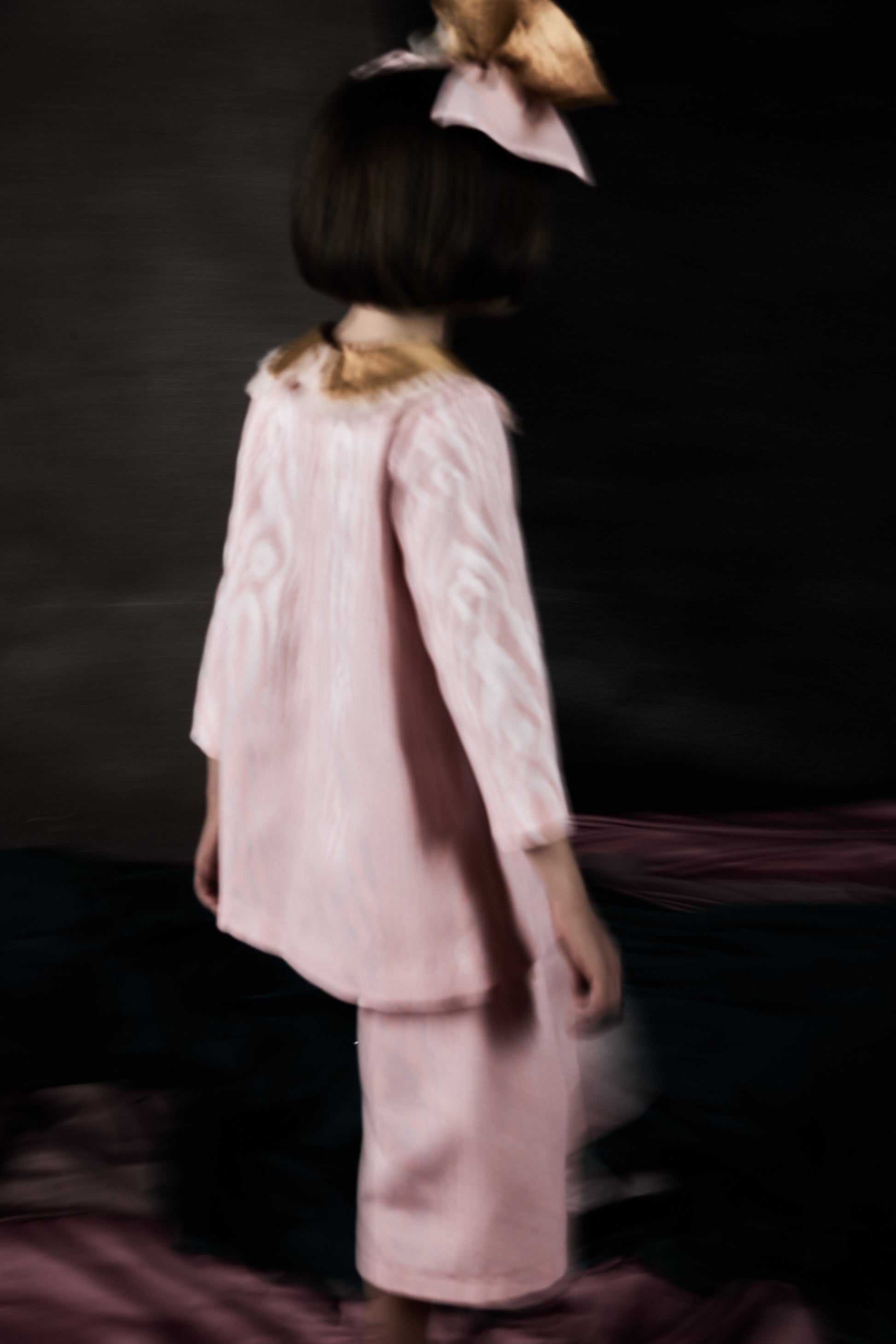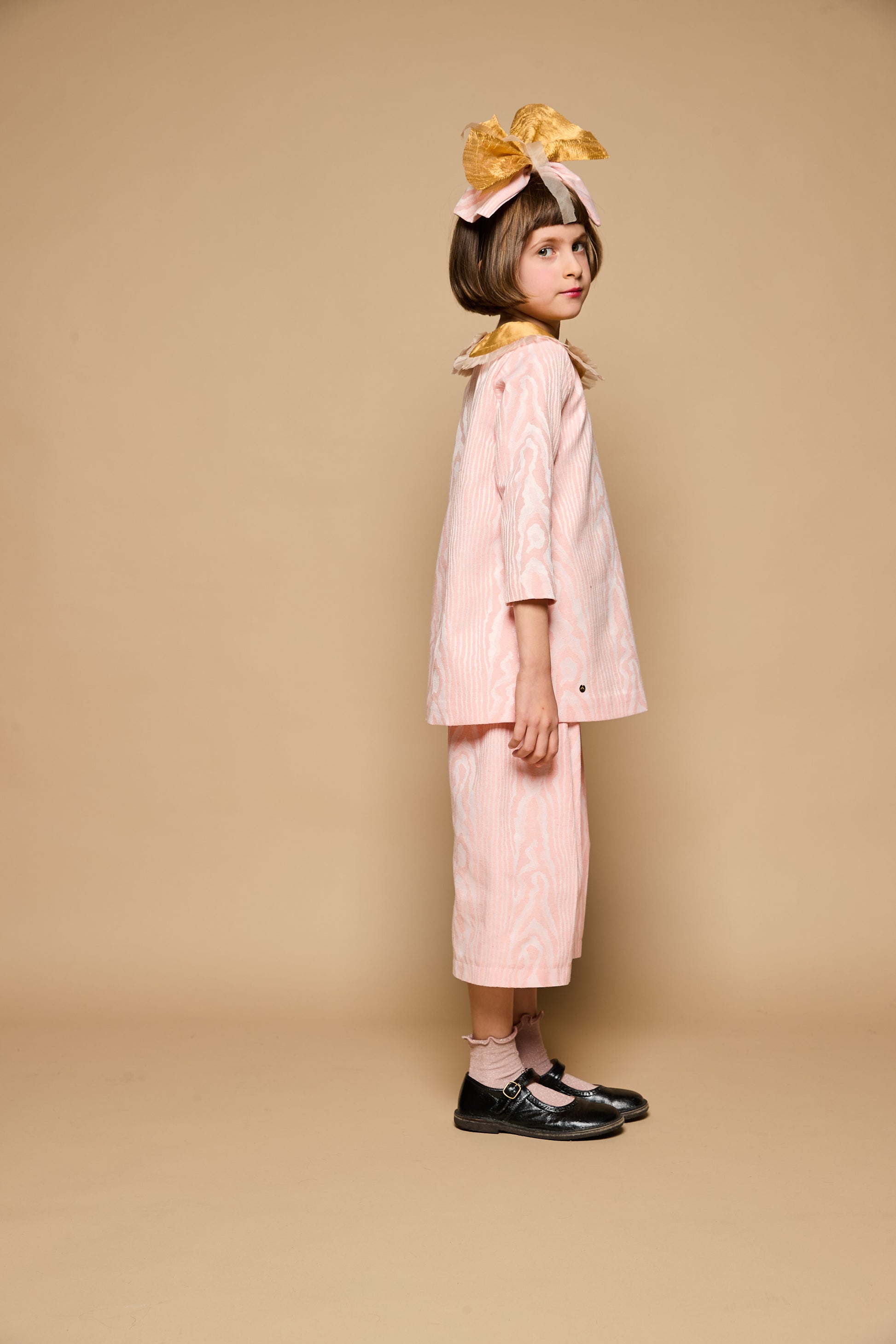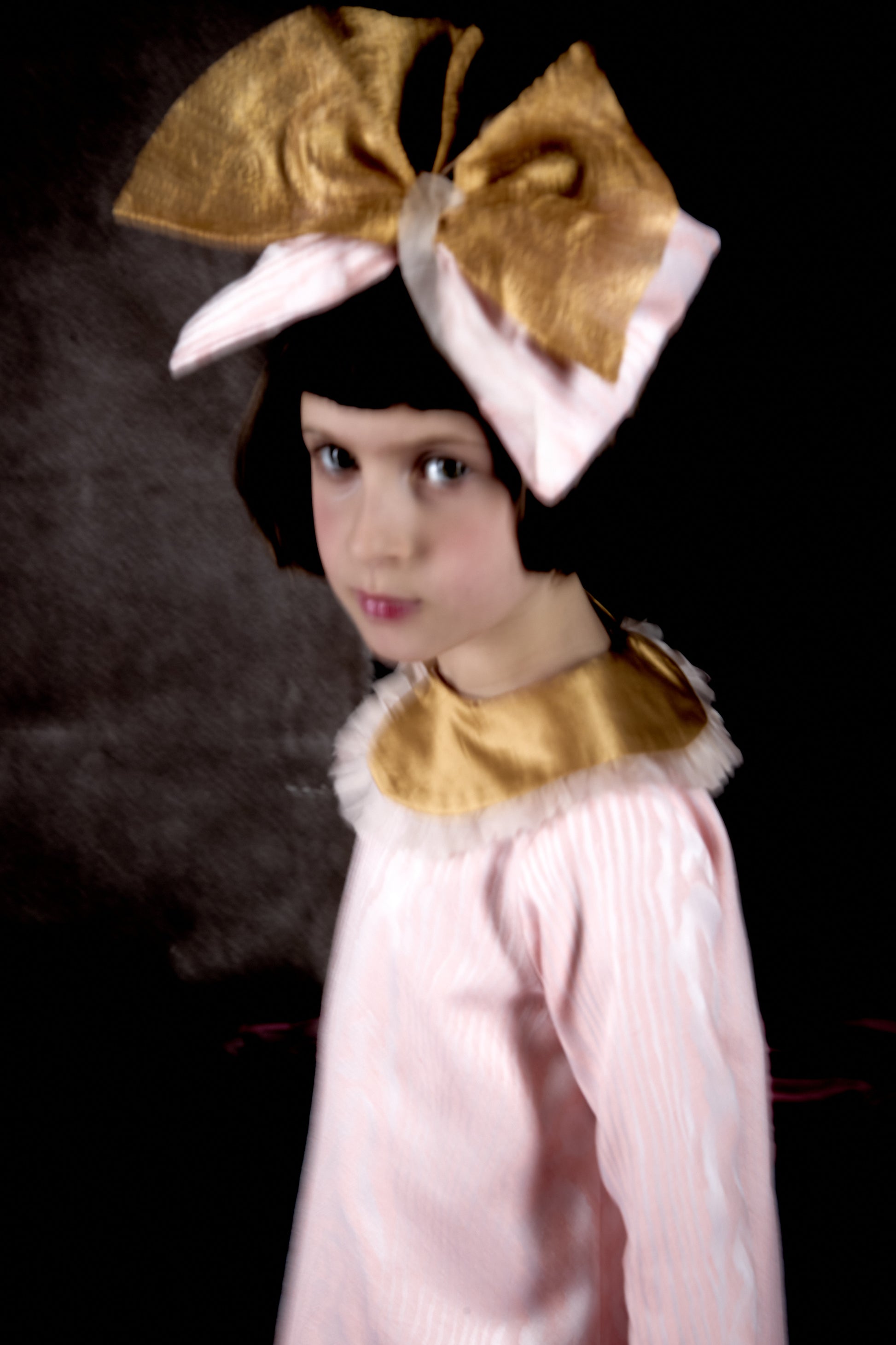 - Colletto Claudine maxi in shantung di seta color oro bordato con ruches di organza plissettata rosa cipria